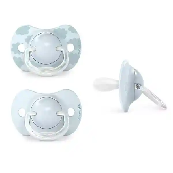 Set de dos chupetes Fisiologico SX Pro ·TETINA FISIOLÓGICA SX PROTM De forma plana y simétrica, queda siempre correctamente colocada en la boquita. Su cuello más fino y ancho y su cabeza más corta y plana están pensados para no invadir la cavidad oral y proporcionar al bebé la misma sensación que experimenta en su estado natural/fisiológico cuando no lleva chupete. Cuello más fino y más ancho · permite cerrar la boca casi completamente. Cabeza más corta · facilita que se doble contra el paladar. Cabeza simétrica más plana · deja a la lengua espacio para reposar. Silicona arenada ultra-suave · imita en textura y consistencia el pezón.
