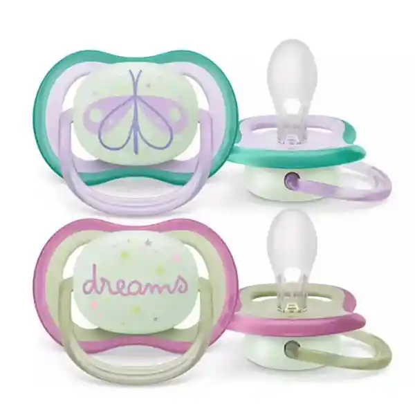 Porque sabemos lo importante que es el sueño de tu bebé, ¡creamos el Chupete Ultra Air Nocturno de Avent! Es perfecto para los pequeños que concilian mejor el sueño con su chupete, ¡sobre todo por las noches! Pues tiene un brillo único en el mango que te ayudará a encontrarlo fácil y rápidamente en la oscuridad o entre las sábanas. Además, su diseño hace que los pequeños lo acepten y usen sin problemas, pues está pensado en el desarrollo bucal de los niños. ¡Y cuentan con ventilación adicional! Gracias a sus orificios para el aire extra grandes, la piel de tu bebé puede ventilarse y mantenerse suave y seca, evitando irritaciones. Su tetina textura sedosa tiene una forma simétrica que protege el paladar, los dientes y las encías de tu bebé según vaya creciendo. ¡Cuidamos lo que más amas! Características: Ventilación adicional: Con los orificios para el aire extragrandes, ventile la piel del bebé a fin de mantenerla suave y seca. Brilla en la oscuridad: Use el botón que brilla en la oscuridad del ultra air para encontrar el chupete de su bebé rápidamente sin tener que encender la luz. Tetina de textura sedosa: Todo en el chupete ultra air se diseñó para que sea ligero y cómodo, incluida la tetina de textura sedosa. Esterilización y almacenamiento sencillos: La funda de viaje ultra air sirve también como esterilizador, por lo que solo tendrá que agregar un poco de agua y meterlo en el microondas. Así podrá asegurarse de que está limpio para el siguiente uso. Desarrollo bucal saludable: Cuida el desarrollo oral de su pequeño con una tetina simétrica que respeta la forma natural de su paladar, dientes y encías. Aceptación de la tetina del 98%*: Cuando preguntamos a las madres cómo respondían sus pequeños a nuestras suaves tetinas de silicona, el 98 %, en promedio, afirmó que su bebé aceptaba los chupetes ultra soft y ultra air de Philips Avent. Libre de BPA Incluye 2 chupetes Edad Recomendada: 0 a 6 meses