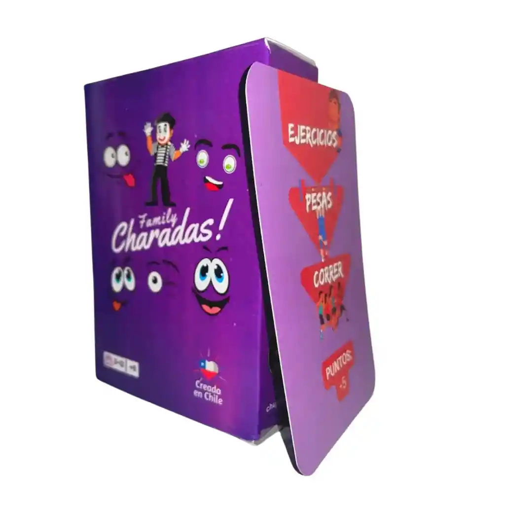 Es un juego de mimicas nacido para reir en familia y basado en el exitoso Chupilca Charadas que la rompio entre el publico mayor. La dinamica es simple y puede ser jugado en equipos de 2 o mas personas, y desde los 10 anos en adelante. <li> Contenido: 60 cartas</li> <li> Jugadores: a 12 personas</li> <li> Edades: De 10 a 200 anos</li> </ul> Como jugar entre 4 o mas jugadores? <ol> <li>Formar 2 equipos de 2 o mas personas</li> <li>Elegir 1 representante por equipo para la primera ronda</li> <li>Sacar una carta para ambos representes (la carta tiene 3 conceptos)</li> <li>Los representantes comienzan a hacer mimicas sin hablar (pueden hacer sonidos), el primer equipo en adivinar gana, pasando ambos inmediatamente al siguiente concepto, el primero el primer equipo en ganar 2 de 3 conceptos gana la carta.</li> <li>Repite la dinamica cambiando los representantes por cada ronda.</li> <li>El primer equipo en juntar 20 puntos gana la partida.</li> </ol> Como jugar entre 3 jugadores? <ol> <li>Un primer jugador saca una carta y comienza a hacer la mimica para los otros jugadores</li> <li>El primer jugador en adivinar dos de tres conceptos, se queda con ella.</li> <li>Luego sigue el de la derecha</li> <li>El primer jugador en juntar 20 puntos gana la partida.</li> </ol>