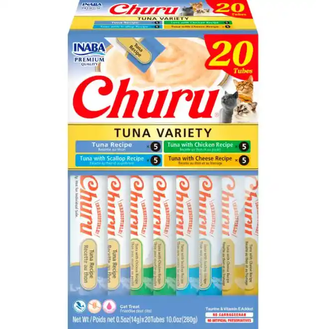 Snack cremoso elaborado con ingredientes de grado humano. Libre de granos, colorantes y preservantes artificiales. Fortalecido con Vitamina E y té verde.Sabores disponibles en la caja: Atún. Atún con pollo Atún con ostión. Atún con queso.