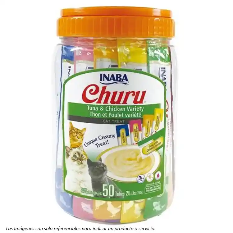 Churu para Gatos práctico Tarrito con 50 tubitos surtidos de las variedades de Atún y Pollo.