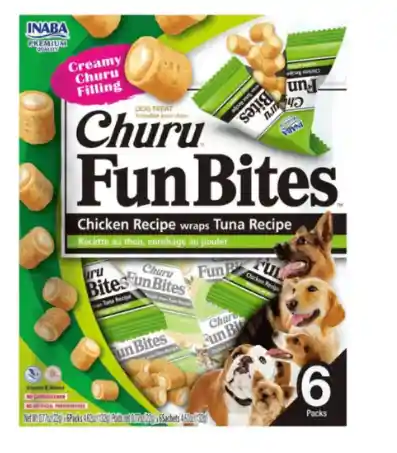 Churu Fun Bites atún es un snack para perro , 100% natural en forma de pequeños bocaditos suaves en forma de almohada, con un relleno Creamy Churu en el interior. Elaborado con sabores naturales, extracto de té verde, taurina y vitamina E. Sin cereales, conservantes ni colorantes artificiales. Características: Hecho con atún Relleno cremoso de Churu, envuelto de una pasta de pollo horneada suave en su exterior. Sin cereales , conservantes ni colorantes artificiales. Cada paquete incluye 8 bolsitas para máxima frescura. 2 texturas diferentes en un bocado Muy útil para administrar pastillas. Presentación: 6 sobres