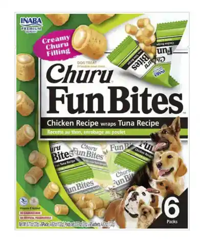 Churu Fun Bites son golosinas de pollo naturales suaves en forma de almohada, con un relleno Creamy Churu en el interior. Elaborado con sabores naturales, extracto de té verde, taurina y vitamina E. Sin granos, conservantes ni colorantes artificiales. Cada paquete incluye seis paquetes tetra para mantener la máxima frescura. Características • Elaborado con 100% puro y natural pollo de granja y atún salvaje • Relleno cremoso de Churu® por dentro, pasta de pollo suave al horno por fuera • Sin granos, conservantes ni colorantes artificiales • Taurina y vitamina E añadidas • Contiene 6 paquetes individuales para máxima frescura • 2 texturas diferentes en un bocado