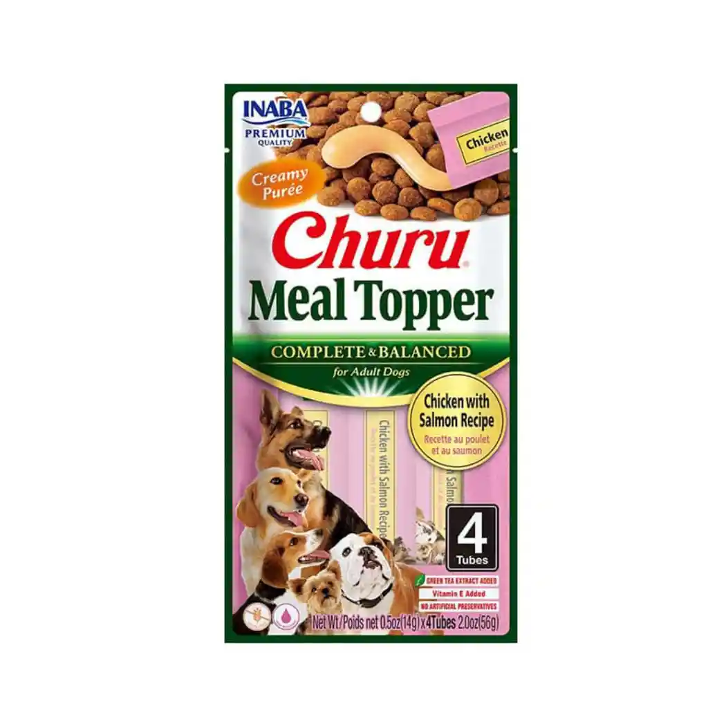Dog Churu™ Meal Topper Pollo y Salmón es un complemento alimenticio premium que combina pollo de granja y salmón en una textura cremosa. Diseñado para añadir sabor y nutrición a la comida habitual de tu perro, este topper es ideal para perros exigentes, aportando hidratación adicional y un sabor irresistible. Al combinarlo con el alimento seco, lo humedece y ablanda, facilitando su masticación y digestión. Beneficios: FAVORECE LA DIGESTIÓN: Los productos INABA utilizan carne real, favoreciendo el proceso digestivo. VITAMINAS Y MINERALES La vitamina E contribuye al efecto antioxidante. La vitamina A favorece la visión. La vitamina D ayuda al correcto crecimiento óseo. EXTRACTO DE TÉ VERDE: El extracto de té verde es rico en antioxidantes y ayuda a disminuir el olor fecal. Ingredientes: Agua, pollo, almidón de tapioca, salmón, sabor natural de pollo, goma guar, extracto de levadura, carbonato de calcio, cloruro de potasio, gelatina, oleorresina de paprika (color), suplemento de vitamina E, sulfato de magnesio, cloruro de colina,