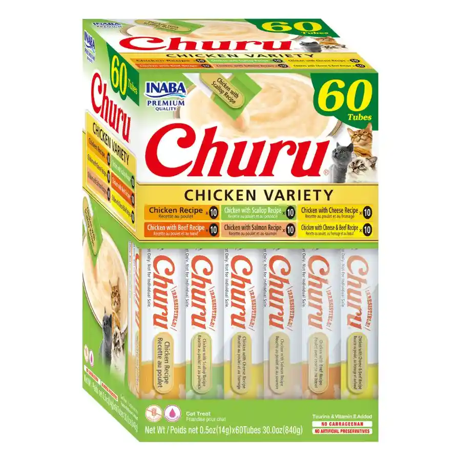 ¡Estos sabrosos snacks para gatos se hacen con atún silvestre o pollo criado en granjas puro y natural! Disponibles en nueve variedades deliciosas, los Churu Purés tienen el alto contenido de humedad necesario para la salud de los felinos. Simplemente rasgue un tubo y apriételo un poco para alimentar a mano a su felino con estos snacks sin cereales ni conservantes. También puede verterlo en un plato o añadirlo por encima de alimentos húmedos o secos. Sin granos, con taurina y vitamina E. Alto contenido de humedad necesario para la salud general de los gatos, bajo en calorías, diseñados para dar de comer con la mano, manera innovadora e interactiva de pasar el tiempo juntos.