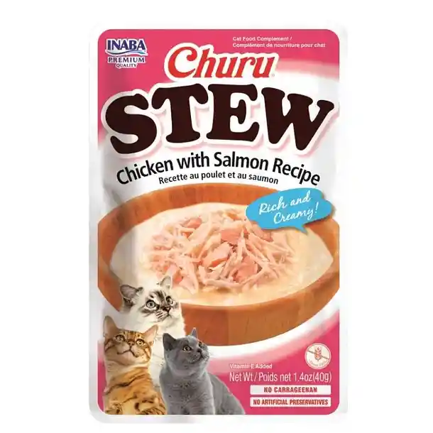 Inaba Churu Stew Pollo y Salmón. Este complemento alimenticio para gatos está elaborado con ingredientes 100% naturales, como pollo criado en granjas y salmón de alta calidad, garantizando una nutrición saludable para tu felino. Perfecto para usar como topper en la comida diaria o como snack, este sabroso y húmedo stew tiene un 86% de humedad y solo aporta 18.8 calorías por paquete, ideal para gatos de cualquier edad. CARACTERISTICAS Ingredientes de alta calidad: Pollo de granja y salmón salvaje. Topper nutritivo: Ideal para acompañar las croquetas diarias de tu gato. Bajo en calorías: Solo 18.8 calorías por bolsa, un snack ligero y saludable. Libre de aditivos: Sin cereales, carragenina, conservantes ni colorantes artificiales. Beneficios para la salud: Enriquecido con Vitamina E y extracto de té verde, apoyando el sistema inmunológico y proporcionando antioxidantes. Conveniente formato: Bolsas individuales listas para servir. Dolphin Safe: Producto que respeta la vida marina. COMPOSICIÓN Caldo de ostión, pollo, salmón, sabores naturales, goma guar, almidón de tapioca, goma xantana, suplemento de vitamina E, extracto de té verde. ANÁLISIS DE LOS COMPONENTES Proteína cruda (mín.) 8% Grasa cruda (mín.) 0,3% Fibra cruda (máx.) 0,1% Humedad (máx.) 88% Vitamina E (mín.) 50 UI/kg 470 kcal/kg (18.8 kcal/pkg) Instrucciones de alimentación: Alimente como una golosina para su gato. Este producto no está destinado a ser alimentado como una comida. Proporcione agua limpia y fresca diariamente. Para la salud de su mascota, visite regularmente a su veterinario. Instrucciones de almacenamiento Refrigere después de abrir y sirva lo antes posible. CONTIENE: Sobre de 40gr