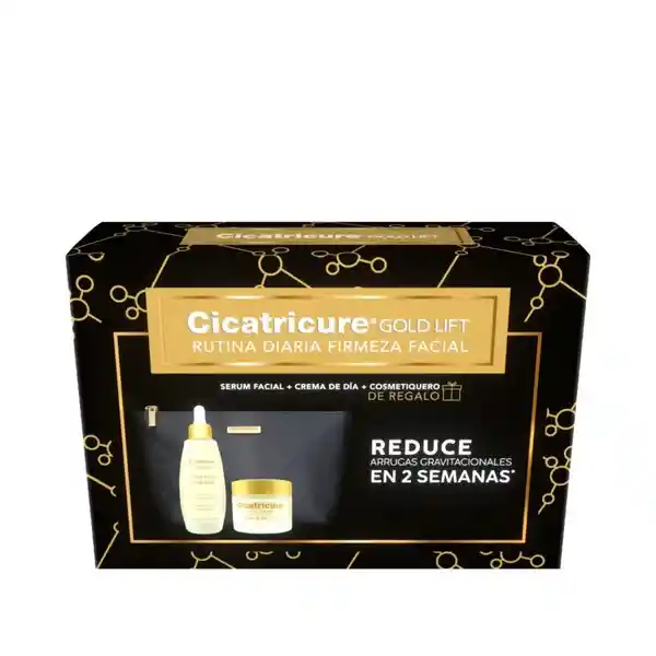 Set Cicatricure Contiene 3 Unidades. Crema Día Gold Lift 1 Und + Sérum 1 Und + Cosmetiquero 1 Und. Cicatricure Gold Lift Crema Reduce Las Arrugas Gravitacionales Gracias a Sus Péptidos Con Oro Calcio y Silicio. Complementa tu Rutina Con el Sérum Facial de Efecto Tensor Para Reducir Arrugas Gravitacionales en 2 Semanas.