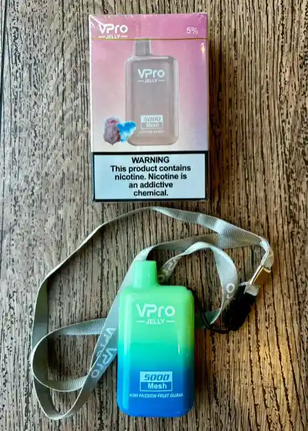 Cigarrillo electronico marca VPRO, 5% de nicotina con sabor a Cotton Candy, de 5000 puffs, recargable con sujetador.