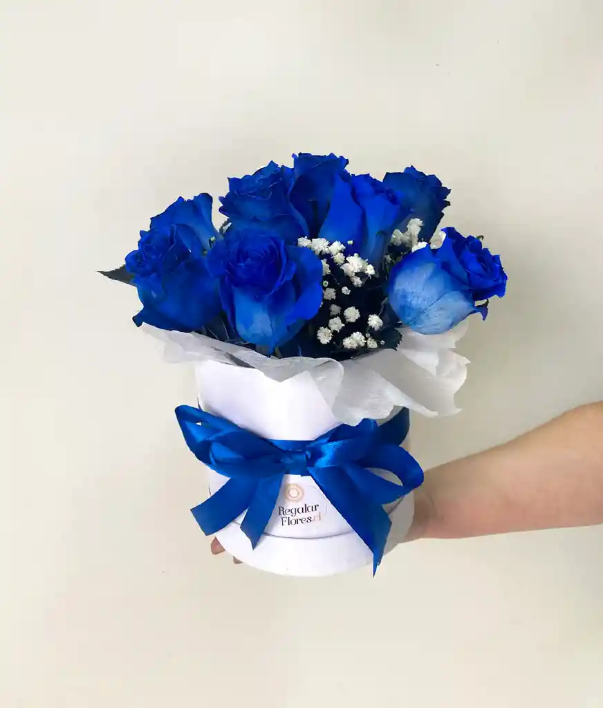 Cajita cilindro blanca de regalo con 9 hermosas rosas ecuatorianas azules y gypsophilia