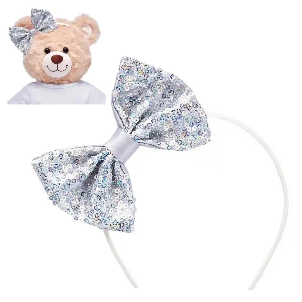 Dale estilo, personalidad y una apariencia tierna y hermosa a tu mejor amiguito peludo Build a Bear. Agrega a tu compra este precioso Cintillo de Moño Plateado con Brillantes Lentejuelas, el cual completará a la perfección cualquier look de tu amigo de peluche. Esta adorable diadema viene con un enorme moño plateado con hermosas lentejuelas las cuales le dan la cantidad de brillo perfecto, ideal para combinar de forma increíble, con la gran gama de atuendos para estos ositos. Haz de tu regalo algo mucho más especial, único y original. A tu amigo peludo le encantará lucir genial mientras disfrutan de inmemorables jornadas de diversión.
