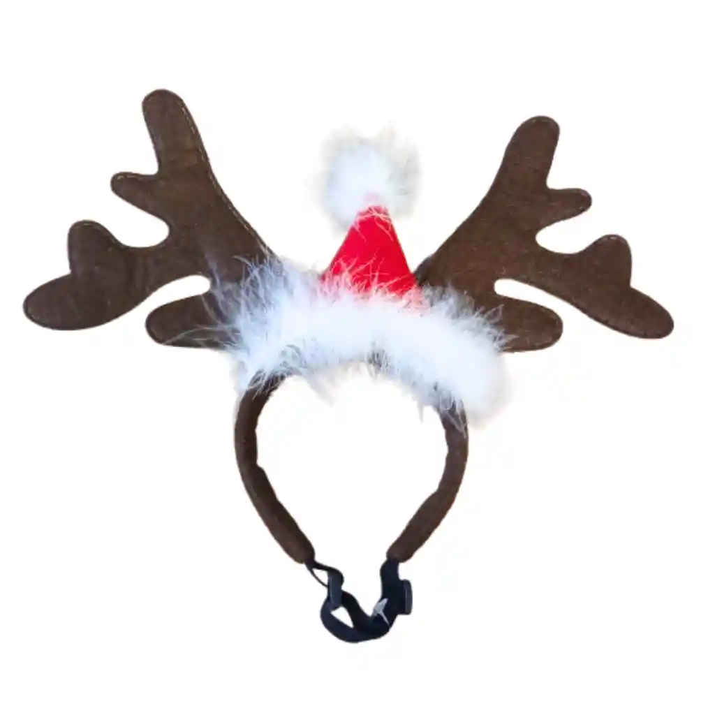 Cintillo navideño con astas de reno y gorro de Papá Noel para mascotas, diseñada para perros o gatos. Material: Típicamente hecha de tela de fieltro suave, felpa corta y materiales plásticos ligeros. Diseño: Cuenta con astas de reno marrones, un pequeño gorro rojo de Papá Noel con borde y pompón de pelusa blanca, y una correa ajustable para la barbilla. Uso: Es un accesorio de disfraz festivo popular para sesiones de fotos, fiestas navideñas, desfiles y reuniones familiares para que las mascotas participen en la diversión de la temporada. Dimensiones: 32 x 28 cm