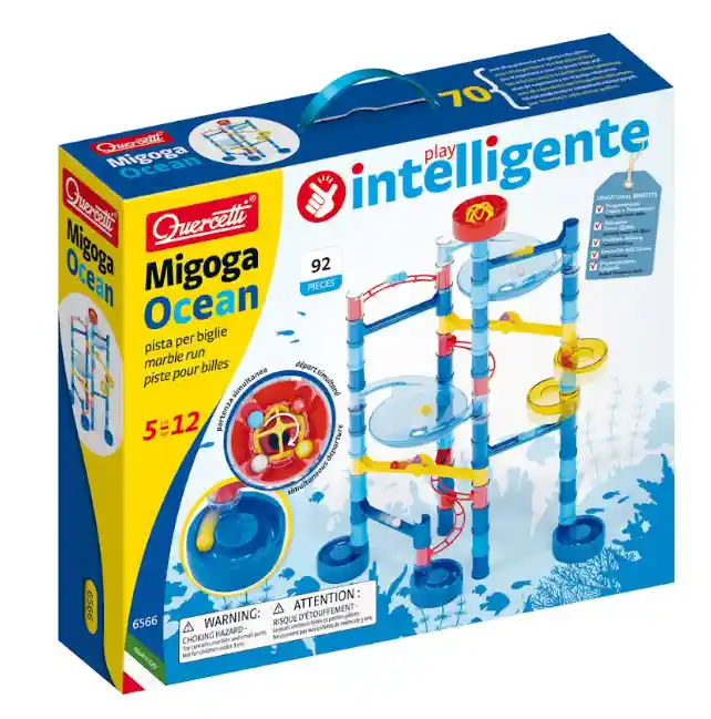 Bolas de colores que despegan al mismo tiempo, pero siguen diferentes caminos, a través de corrientes oceánicas, aguas profundas, islas tropicales y mundos submarinos, navegando por vórtices, líneas rectas y curvas, en esta pista de mármol que presenta las formas y colores del océano. Hay un montón de piezas para construir pistas como las de las ilustraciones, o para crear unas completamente nuevas y originales. Los toboganes, puentes, columnas y espirales se pueden unir fácilmente en infinitas combinaciones para un tiempo de juego divertido sin fin. La creatividad y el razonamiento son indispensables para construir pistas bonitas y, lo que es más importante, otras que funcionen. Solo se utilizan materiales de alta calidad, resistentes e inastillables, para garantizar que encajen con precisión y formen una estructura sólida. Incluye: 1 + 1 salida múltiple, 5 pistas rectas cortas, 7 raíles curvos, 50 columnas transparentes y de colores, 2 embudos, 2 interruptores, 5 + 5 bases / caracoles, 2 tapón de caracol eva, 12 canicas de colores.