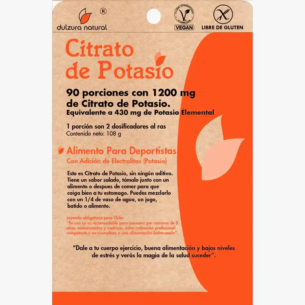 90 porciones con 1.200 mg de Citrato de Potasio, equivalente a 430 mg de Potasio Elemental 1 porción son 2 dosificadores al ras Tiene un sabor salado, tómalo junto con un alimento o después de comer para que caiga bien a tu estomago. Puedes mezclarlo con un 1/4 de vaso de agua, un jugo, batido o alimento. No contiene ningún aditivo o químico adicional Beneficios : – Es un importante electrolito – Ayuda a prevenir cálculos renales y cálculos de ácido úrico: Al tomar potasio junto con aumentar el consumo de frutas y verduras se encontró que disminuyen la excreción de calcio urinario. – El potasio suplementario puede ayudar a disminuir presión arterial, pero las dosis deben estar recetadas por un médico – Ayuda a prevenir el riesgo de enfermedades cardiovasculares y de accidente cerebrovascular – Ayuda a prevenir y regular la hipertensión – Ayuda al Mantenimiento de la salud ósea, siempre y cuando existan buenos niveles de vitamina D y calcio en tu cuerpo