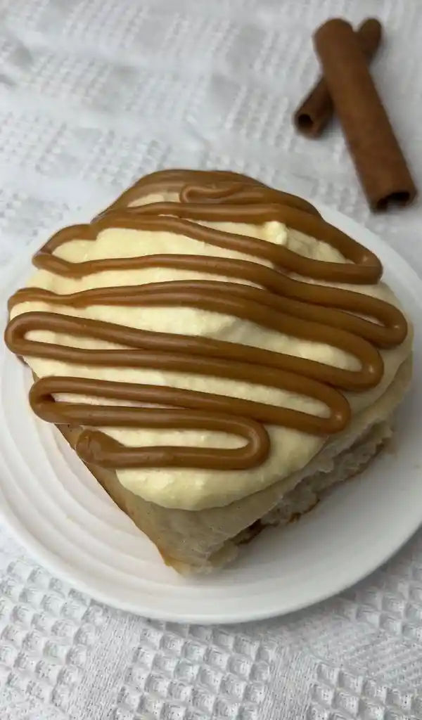 Rollo de canela individual con icing de queso crema y dulce de leche.