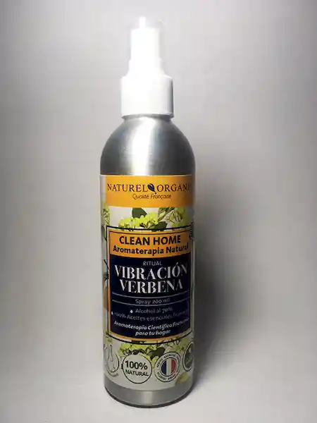 Aromatizador ambiental en spray. 100% natural con una mezcla de aceites esenciales donde predomina Verbena. Contiene alcohol al 70% lo que permite además limpiar el ambiente. No testeado en animales. Origen: Francia.