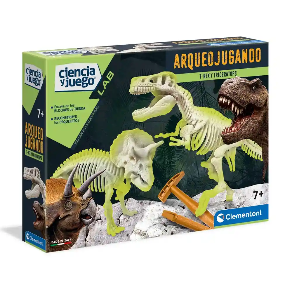 Con este juego científico darás vida a una lucha feroz entre presa y depredador. Excava en los bloques y saca a la luz los fósiles de dos temibles dinosaurios: ¡T-Rex y Triceratops!. Monta los dos esqueletos fosforescentes y obsérvalos a oscuras: ¡se iluminarán! Además del manual de instrucciones, en la caja hay 5 fichas ilustradas con las que aprenderás muchos datos científicos sobre los dinosaurios. Concebido, diseñado y desarrollado en Italia. Contiene : Martillo, Cincel, Bloques de tierra, "Fósiles de Dinosaurios, Carta de las Criaturas legendarias, Manual Ilustrado. Se recomienda de 7 años en adelante.