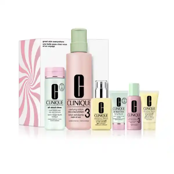 Set Clinique Incluye 6 Unidades: Jabón Líquido All About Clean Liquid Facial Soap Oily Skin Formula (Tamaño Regular) 200 mL + Loción Facial Clarifying Lotion 3 (Tamaño Jumbo) 487 mL + Gel Facial Dramatically Different Oil-Free Gel (Tamaño Regular) 125 mL + Jabón Líquido All About Clean Liquid Facial Soap Oily Skin Formula 30 mL + Loción Facial Clarifying Lotion 3 60 mL + Gel Facial Dramatically Different Oil-Free Gel 30 mL. Set Great Skin Everywhere Piel Grasa el Kit de Navidad Más Deseado de Clinique Contiene Sus Tres Pasos Característicos Para Una Piel Radiante en Casa o Durante un Viaje. Personalizado Para Pieles Más Grasas. Estos 3 Pasos le Darán a Las Pieles Más Grasas Exactamente lo Que Necesitan Para Tener Una Piel Maravillosa.