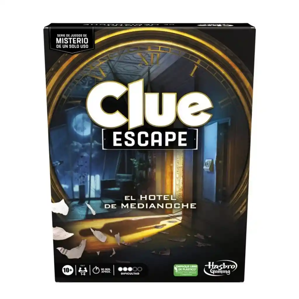 Tras el asesinato del Dr. Black en la Mansion Tudor, tu y el resto de sus invitados reciben una invitacion para celebrar un acto en su memoria en el El Hotel de Medianoche. Alli, sabran que el chantaje que tenia preparado para cada uno de ustedes todavia existe... y que uno de ustedes intento robarlo recientemente! Ahora, deberan deducir QUIEN intento robar los documentos de chantaje, DONDE los guardo, y CUAL es la contrasena para acceder a ellos. El juego Clue Escape: El Hotel de Medianoche incluye a los clasicos personajes e historia de Clue y es una fascinante experiencia al estilo escape la habitacion que permite que los jugadores empiecen a jugar de inmediato con poca preparacion. Los jugadores mueven sus peones por el tablero tridimensional que se va armando habitacion por habitacion a medida que toman tarjetas, resuelven rompecabezas, abren nuevas habitaciones y usan su deduccion para descubrir pistas. Tras escapar del hotel, los jugadores revisan las pistas que han recolectado para hacer una acusacion correcta y ganar la partida! Reune a tus amigos y familiares para participar en una fascinante experiencia con este juego que se juega una sola vez. Tambien es un excelente regalo para los fans del juego Clue original y de los juegos de misterio y asesinato. Para 1 a 6 jugadores a partir de 10 anos.