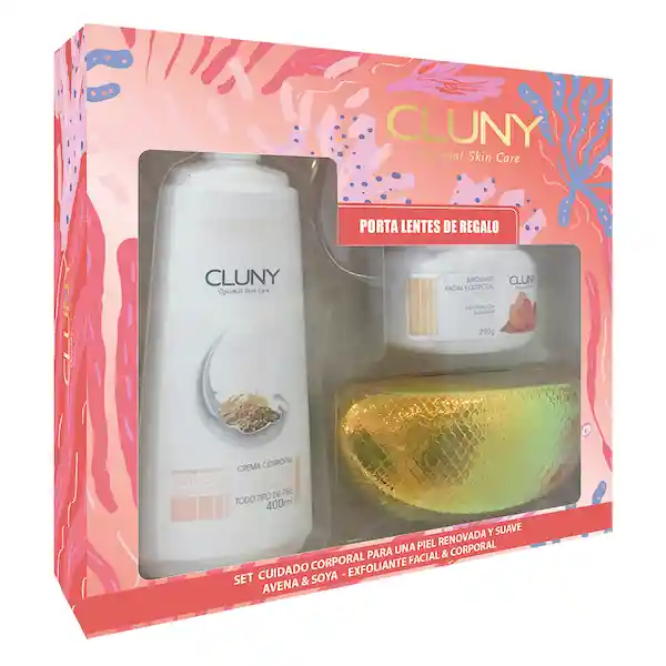 1 Cluny Body Crema Corporal Avena Soya Pote Con 400 mL + 1 Cluny Gel Exfoliante Durazno Pote Con 290 g + 1 Porta Lentes