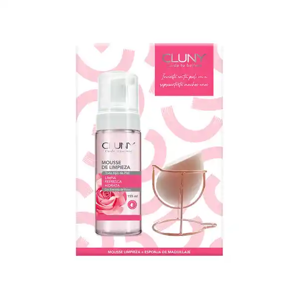 Set Cluny Contiene 2 Unidades. Mousse de Limpieza Facial Extracto Rosa 155 mL + Esponja Con Base Para Guardar 1 Und.
