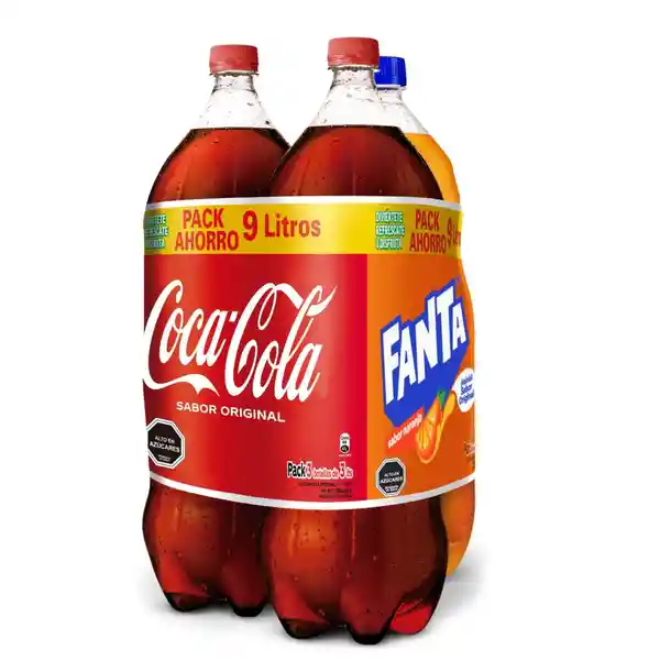 Contiene 3 Unidades de 3 L c/u. Coca-Cola Bebida Original 2 Und de 3 L c/u + Fanta Bebida 3 L.