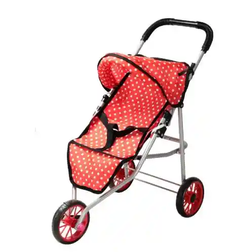Hermoso coche con tres ruedas plásticas, de cuerpo metálico, especial para que puedas pasear a tus muñecas. Viene con una bonita tela estampada en color rojo y puntitos blancos. Envase de bolsa, medidas aprox. 56x30x48 cm.
