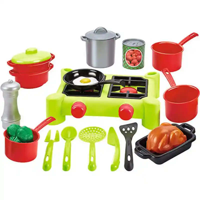 Set para jugar al chef presentado en un atractivo diseño y vivos colores, para una entretención duradera que invita al juego imaginativo y estimula la motricidad fina. La cocina de sobremesa de 2 quemadores es una réplica de una real. El conjunto incluye un total de 21 accesorios: un juego de ollas, una sartén, una bandeja para hornear, utensilios de cocina, brócoli, una lata de tomates, un salero y un pollo asado. Material: plástico de alta calidad según normativa de seguridad europea. Medidas cocina: 26 x 20 x 7 cm. Edad: 18+ meses. Fabricado en Francia por Ecoiffier.