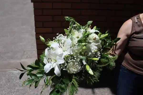 Cojín de flores blancas para condolencias. Contiene lilium blanco, rosas blancas, llisianthus blanco, toques de ilusión. Ruscus y follaje de la temporada.