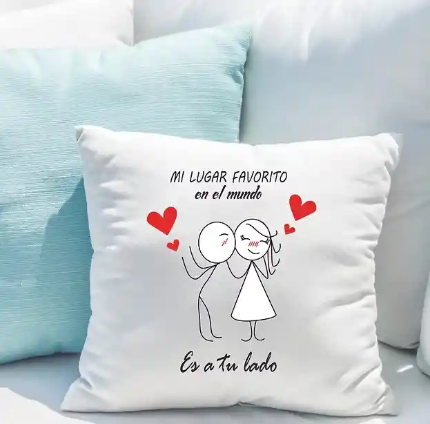 Cojín palito - Mi lugar favorito en el mundo es a tu lado Ficha del producto: Medidas 35x35, Material Bistrech blanco para el diseño y de color rojo para la parte posterior, relleno soft sintético, cojín decorativo.