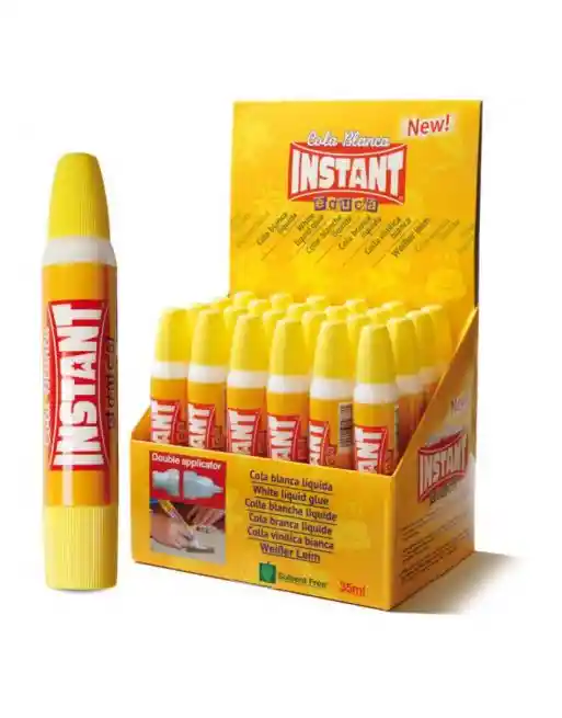 Cola blanca de uso escolar a base de componentes naturales y sin disolventes para pegar materiales porosos como papel, cartón, cartulina, madera, piel, tejidos, goma, etc. El diseño del bote con dos aplicadores de distintas anchuras facilita su uso.