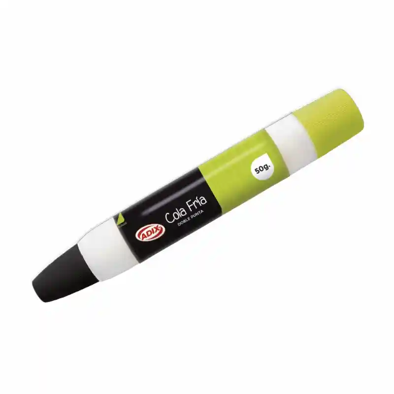 Cola fría doble punta Adix. 50 gramos. Cola fría doble punta. Permite trabajar de una manera mucho mas fácil, ya que tiene un dosificador pequeño para aplicar pequeñas cantidades y uno más grueso el cual aplica y arrastra la cola fría. Pega: cartón, madera, telas, trabajos artesanales, etc. Cantidad 50 gr. Producto NO TÓXICO. Producto no apto para niños menores de 3 años.