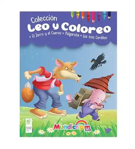 Colección Leo y coloreo nos presenta 3 hermosos cuentos para leer y pintar, El Zorro y el Cuervo, Pulgarcita, Los tres Cerditos. A través de esta colección, las niñas y los niños disfrutaran la lectura de entretenidos cuentos y estimularan su creatividad e imaginación, coloreando divertidos personajes y lugares mágicos donde ellos viven. Se recomienda para 4 años en adelante.
