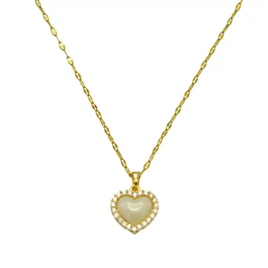 Hermoso colgante con forma de corazon y bordeado con bellas zirconias cubicas, su color central esta dado con una resina blanca que le da un toque dulce y tierno, termina esta bella pieza con un chapado en oro 18k que da una durabilidad y resistencia unica. Regalo ideal para pues es simplemente sublime y minimalista. Se puede usar en conjunto con otros colgantes para formar looks multicapas. Material: Chapada en oro 18k. Longitud: 40 cm (Largo) + 5 cm (Extensión) Piedras: Zirconia cubica Peso aprox 5 g aproximadamente Todos nuestros productos son enviados en bella presentación de regalo.