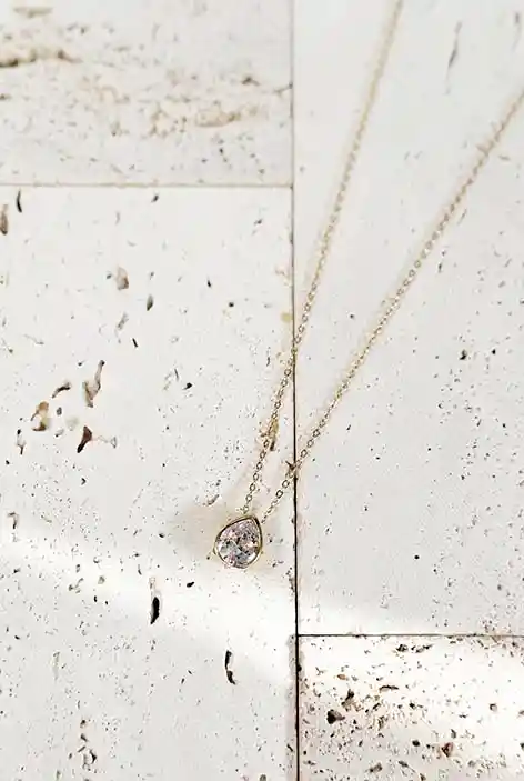 Este elegante collar destaca por su circón en forma de gota engastado en un bisel dorado que complementa su brillo. La cadena de eslabones pequeños agrega un toque delicado al conjunto, haciendo de este colgante una pieza ideal para novias que buscan un accesorio sutil y sofisticado.