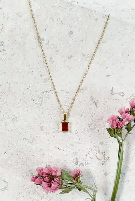 Colgante con un vibrante circón rojo en el centro, engastado en grifas para realzar su brillo y color. La estructura del colgante se complementa con un valier en forma de V, dándole un toque de elegancia moderna. Su diseño único lo convierte en una joya perfecta para añadir un toque de color y sofisticación a cualquier atuendo.