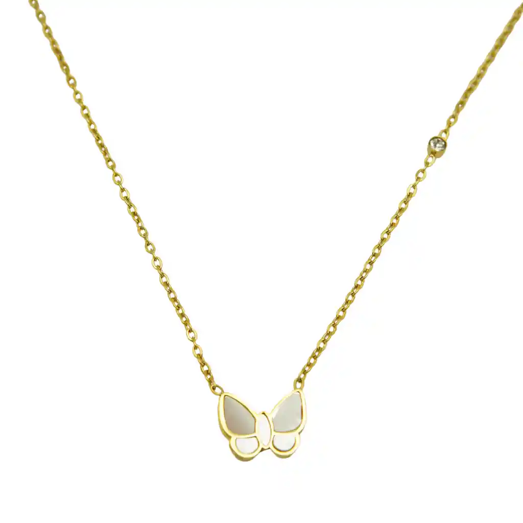 Hermoso colgante de mariposa decorado con hermoso nácar enmarcado en bello y resistente chapado en oro de 18kl. Elaborado en material hipoalergénico, ideal para pieles sensibles. Y para adicionar más dulzura a este collar se le suma un lindo punto de luz en el trayecto de la cadena. Ideal tanto para las grandes, como para las chicas de la casa. Material: Chapada en oro 18k. Piedras: Zirconio cubico