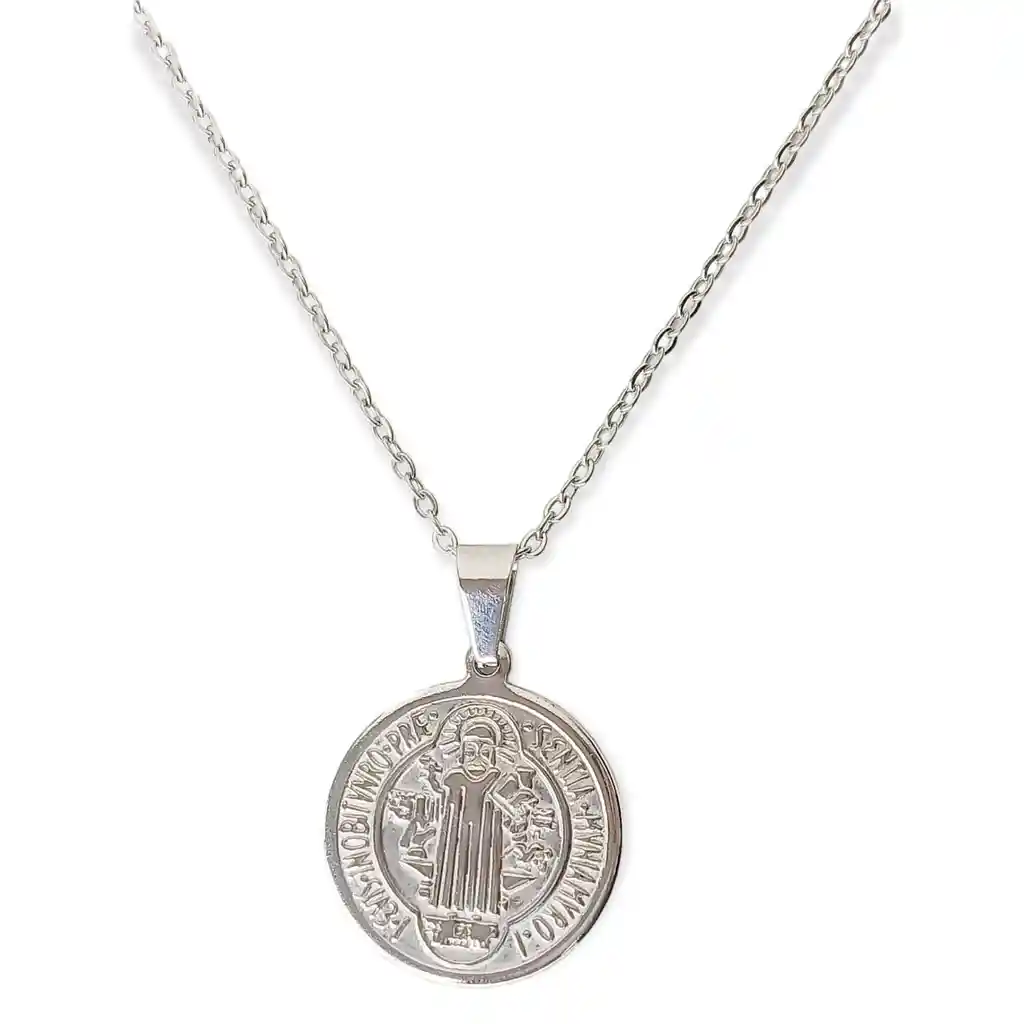 Descubre la belleza y protección del colgante de la medalla de San Benito. Fabricado en acero inoxidable de excelente calidad, este hermoso colgante presenta la icónica medalla de San Benito en su dije, disponible en color plata. San Benito, el Santo Patrono de Europa y fundador de la Orden Benedictina, ha sido definido como "un astro luminoso" en tiempos de crisis de valores. Las dos caras de la medalla tienen una serie de letras que confieren un gran poder a este objeto, alejando las tentaciones y espíritus del mal y desviando los temores. Siente la seguridad de que estás cuidado y protegido en el día a día con este colgante de medalla de San Benito. Además, todos nuestros productos se envían en una elegante presentacion para regalo. Ofrecemos joyas únicas que cuentan historias especiales. Contamos con una amplia variedad de joyas de metales preciosos, gemas y arte adaptados a los gustos de nuestros clientes. Además, ofrecemos auténticas piedras preciosas de la mejor calidad. Descubre nuestros productos en plata, oro, oro rosa y acero quirúrgico 316L, perfectos para cualquier ocasión. Encuentra el regalo u obsequio perfecto para cumpleaños, aniversarios, San Valentín, día de las madres, día del padre, graduaciones, viajeros, bodas y más. ¡Regalos originales y obsequios para todo tipo de fanáticos!