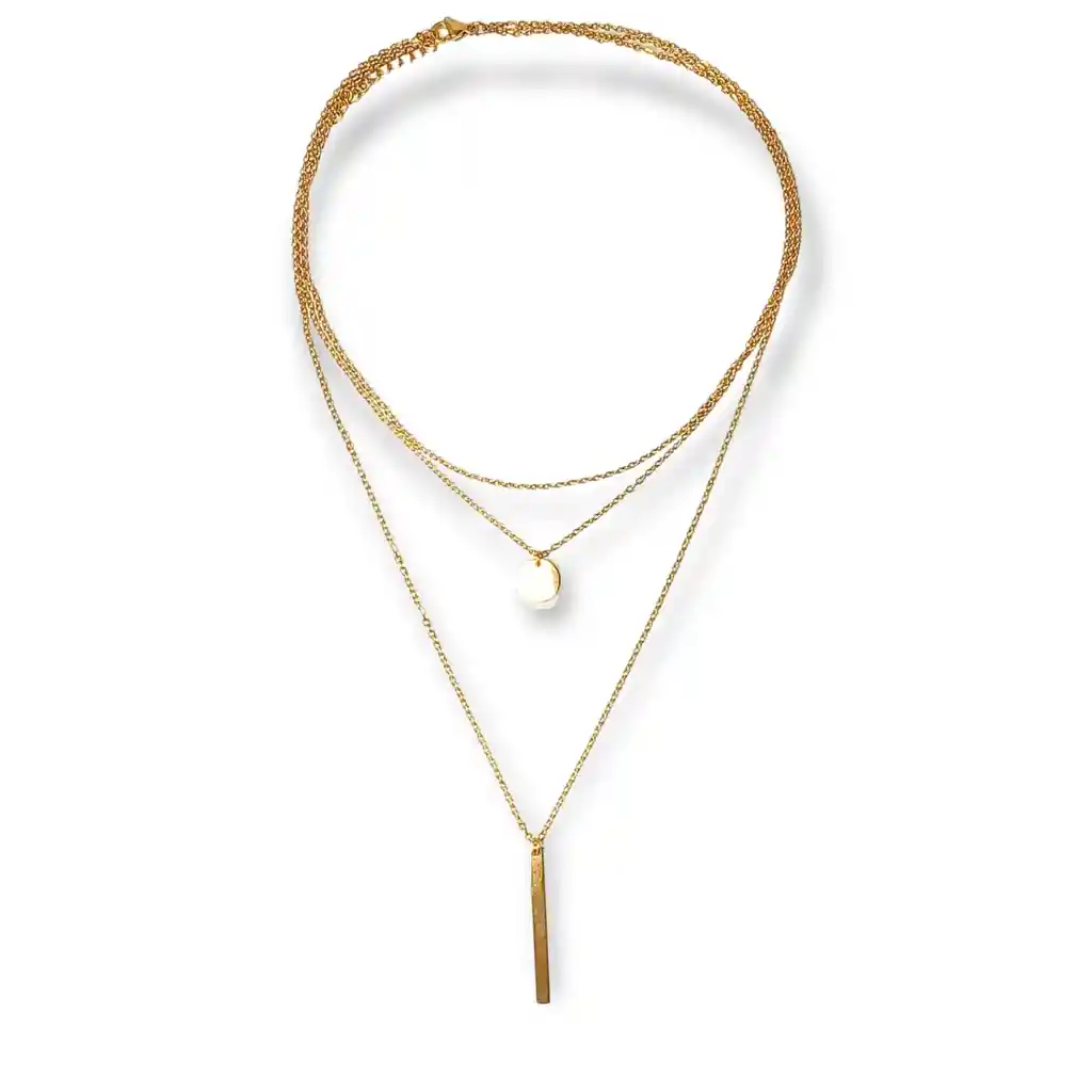 Colgante multicapa minimalista. Material hipoalergénico chapado en oro Largo de la cadena mas corta: 36 cm + 4 cm Peso aprox: 15 gr (Se envía con bella caja de regalo) Ofrecemos joyas únicas que cuentan historias especiales. Contamos con una amplia variedad de joyas de metales preciosos, gemas y arte adaptados a los gustos de nuestros clientes. Además, disponemos de auténticas piedras preciosas de la mejor calidad. Descubre nuestros productos en plata, oro, oro rosa y acero quirúrgico 316L, perfectos para cualquier ocasión. Encuentra el regalo u obsequio perfecto para cumpleaños, aniversarios, San Valentín, día de las madres, día del padre, graduaciones, viajeros, bodas y más. ¡Regalos originales y obsequios para todo tipo de fanáticos! Una joya o accesorio es el obsequio perfecto pues siempre añade un toque de elegancia a tu atuendo y look.