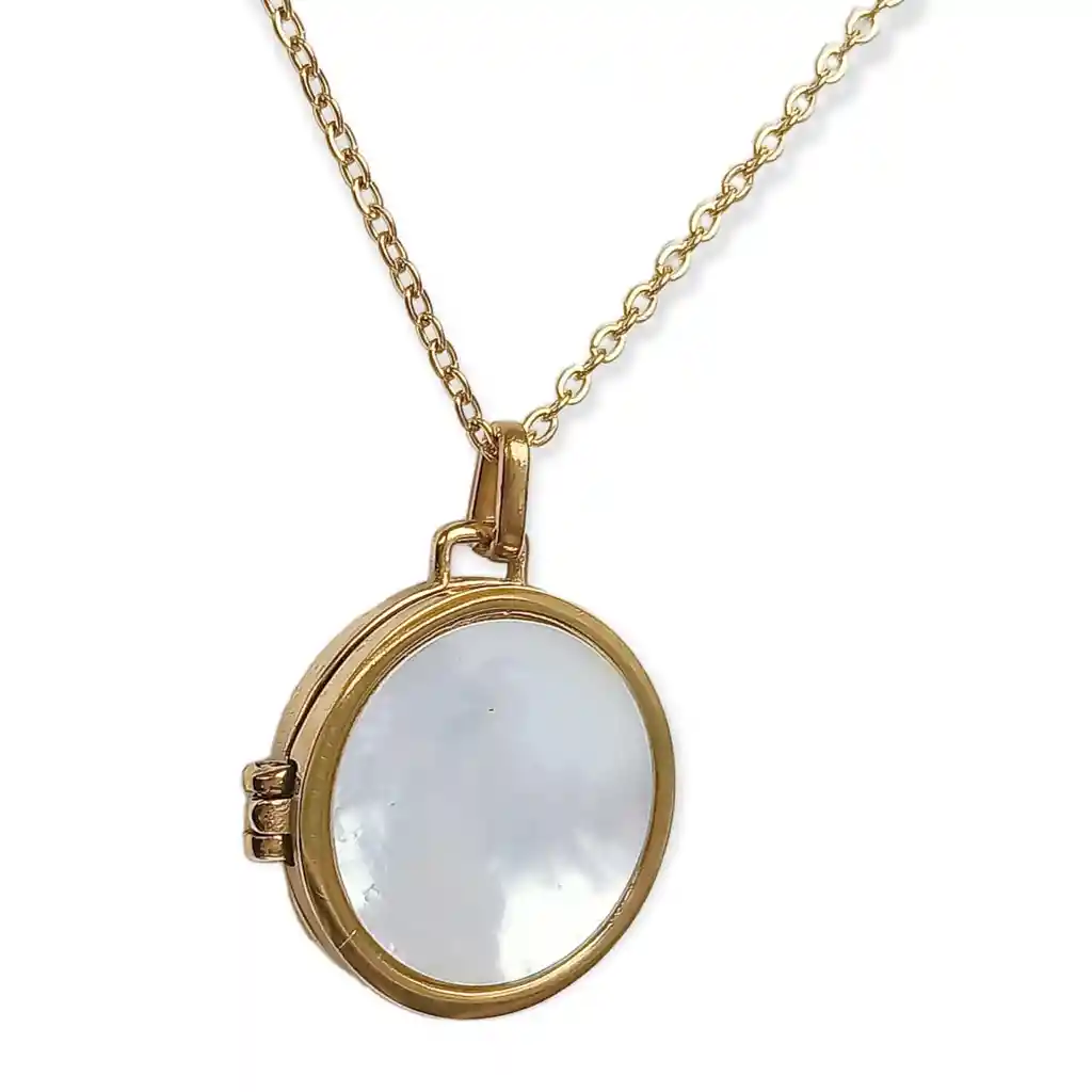 Hermoso colgante relicario redondo chapado en oro 18kl; En su medalla encontraras una superficie lisa fabricada en material sintético de color Nácar. Material: Chapado en oro 18kl Peso aprox 7 g Dimensiones: Largo de la cadena 46 cm + Extensión de 6cm // Dije: Diámetro 2 cm. (Todos nuestros artículos se envían con bella caja de regalo)