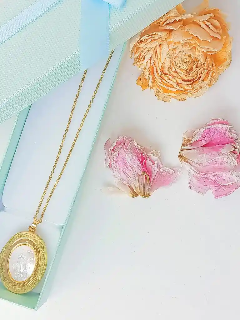 Hermoso colgante relicario de la Virgen María chapado en oro 18kl; En la parte frontal del relicario encontraras una hermosa medallita de Virgen Guadalupe, tallada en material sintético de color Nácar. Material: Chapado en oro 18kl Peso aprox 7 g Dimensiones: Largo de la cadena 40 cm + Extensión de 6cm // Dije: 2.5 cm (Ancho) x 3 cm (largo) (Se envía con bella caja de regalo)