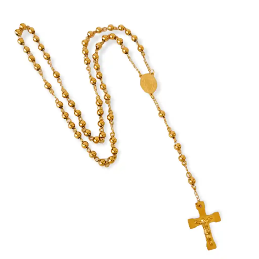Hermoso Rosario o camándula, como también se le dice; ¿Con que nombre lo conoces tú? La palabra Rosario significa “Corona de Rosas”, es la rosa de todas las devociones y es la más importante. Su forma física, no es más que un objeto que lleva por nombre: contador, el cual utilizamos para llevar un mejor orden al rezarlo, pero lo más importante es meditarlo. Se llama Rosario a la sarta de cuentas que se utiliza para rezar el rosario. Las cuentas están separadas cada diez por otras de distinto tamaño y la sarta está unida por sus dos extremos a una cruz. Las oraciones que componen el Rosario están ordenadas en conjuntos de diez Avemarías, llamadas décadas. Cada década está precedida por un Padrenuestro ("Padre Nuestro") y tradicionalmente seguida por un Gloria . Muchos católicos también optan por recitar la oración "Oh mi Jesús" después del Gloria, que es la más conocida de las siete oraciones de Fátima . Durante la recitación de cada juego, se piensa en uno de los Misterios del Rosario , que recuerdan los acontecimientos de la vida de Jesús y María . Se rezan cinco décadas por rosario. Las cuentas del rosario son una ayuda para decir estas oraciones en la secuencia adecuada. Te recordamos que todas tus compras en nuestra tienda se envían en una bella cajita de regalo. Material: Chapado en oro 18k. Longitud: 64 cm de largo Ofrecemos joyas únicas, que cuentan historias especiales. Contamos con una amplia variedad de joyas de metales preciosos, gemas y arte adaptados a los gustos de nuestros clientes. Además, ofrecemos auténticas piedras preciosas de la mejor calidad. Descubre nuestros productos en plata, oro, oro rosa y acero quirúrgico 316L, perfectos para cualquier ocasión. Encuentra el regalo u obsequio perfecto para navidad, dia de reyes, cumpleaños, San Valentín, aniversario, día de las madres, día del padre, graduaciones, bodas, obsequios para niñas, niños, para dama, caballeros, viajeros y más. ¡Regalos originales y obsequios para todo tipo de fanáticos y amantes de la vida!
