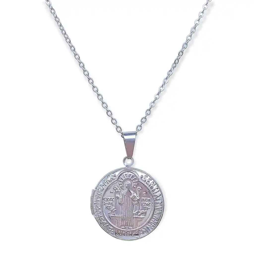 ¡Gracias por tu visita! ¡4 años de compromiso con nuestra clientela! ¿QUIERES ENVIARSELO A UN SER QUERIDO COMO REGALO? Nosotros nos dedicamos a que la presentación sea tan hermosa como la prenda que llevas. Hermoso relicario, guarda foto con la imagen en relieve de San Benito, fabricado en acero inoxidable de excelente calidad. Dentro del mismo puedes colocar la estampita que te acompaña siempre, al igual que una foto de algún ser especial. Disponible en color plateado. ¿Qué simboliza la medalla de San Benito? Las dos caras de la medalla tienen una serie de letras que por sí solas no tienen un sentido. Realmente son abreviaturas de frases que le confieren un gran poder a este objeto. A la medalla de San Benito se le atribuye el poder de alejar las tentaciones y espíritus del mal. También se usa para desviar los temores. San Benito protector, sentirás la seguridad de que tu camino cuida y te protege en el día a día. Es importante que sepas que todos nuestros productos se envían en bella cajita de regalo. Características: Metal: Acero inoxidable antialérgico Piedra: No posee Peso aprox: 15gr Dimensiones: Largo cadena 60cm/Tamaño dije 31mm diámetro (Se envia en bella presentacion para regalo) Ofrecemos joyas únicas que cuentan historias especiales. Contamos con una amplia variedad de joyas de metales preciosos, gemas y arte adaptados a los gustos de nuestros clientes. Además, disponemos de auténticas piedras preciosas de la mejor calidad. Descubre nuestros productos en plata, oro, oro rosa y acero quirúrgico 316L, perfectos para cualquier ocasión. Encuentra el regalo u obsequio perfecto para cumpleaños, aniversarios, San Valentín, día de las madres, día del padre, graduaciones, viajeros, bodas y más. ¡Regalos originales y obsequios para todo tipo de fanáticos! Una joya o accesorio es el obsequio perfecto pues siempre añade un toque de elegancia a tu atuendo y look. (Se envia en bella presentacion para regalo) Ofrecemos joyas únicas que cuentan historias especiales. Contamos con una amplia variedad de joyas de metales preciosos, gemas y arte adaptados a los gustos de nuestros clientes. Además, disponemos de auténticas piedras preciosas de la mejor calidad. Descubre nuestros productos en plata, oro, oro rosa y acero quirúrgico 316L, perfectos para cualquier ocasión. Encuentra el regalo u obsequio perfecto para cumpleaños, aniversarios, San Valentín, día de las madres, día del padre, graduaciones, viajeros, bodas y más. ¡Regalos originales y obsequios para todo tipo de fanáticos! Una joya o accesorio es el obsequio perfecto pues siempre añade un toque de elegancia a tu atuendo y look.