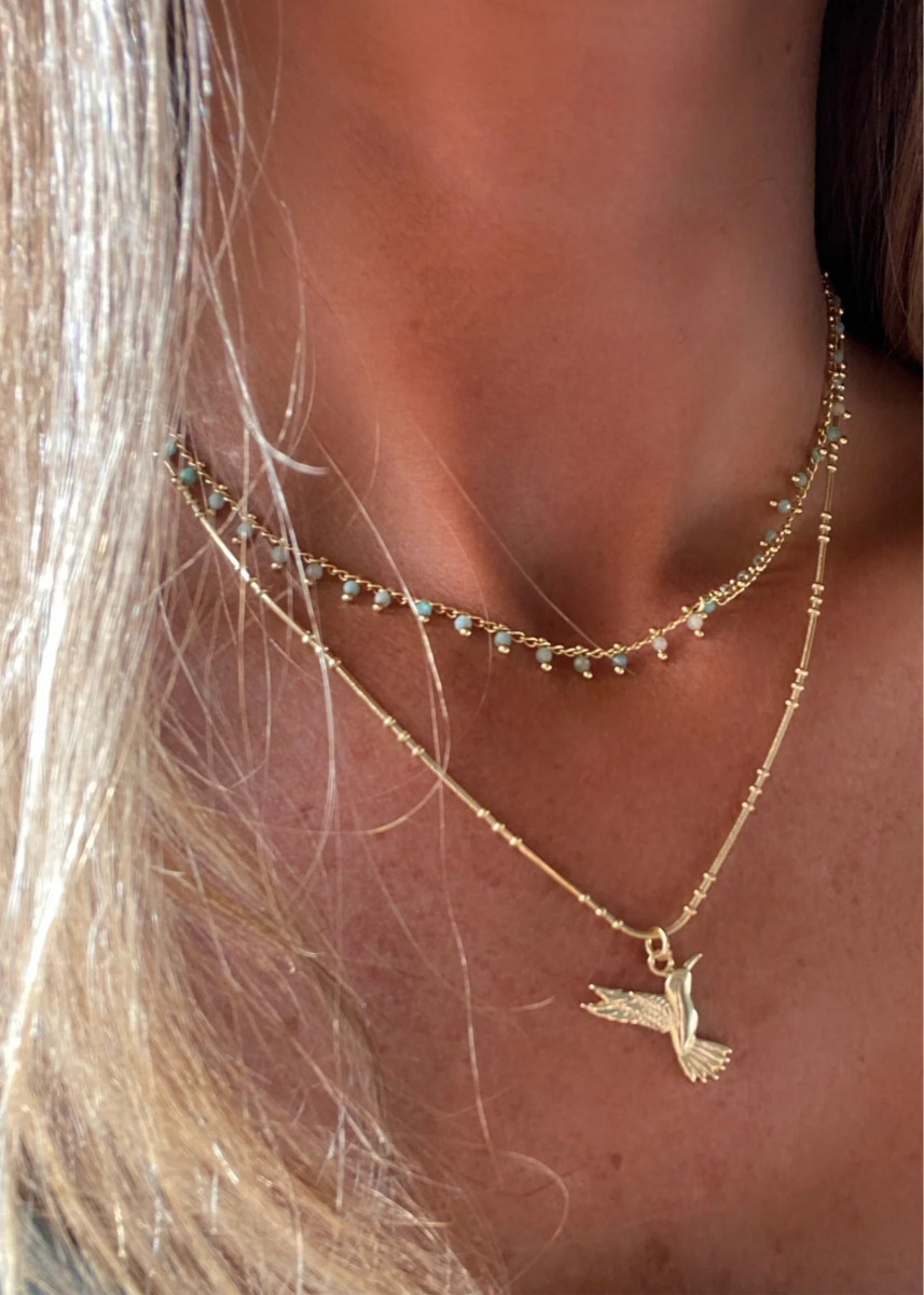 El collar ideal para usar todos los días, con lo que te pongas queda bien y le da un toque distinto y colorido.Tiene 40 cm con alargue a 45 cm y puedes elegir entre 3 opciones de piedras: amazonita, ónix y turmalina. Material: bronce enchapado en oro 18 kilates, libre de níquel. Hipoalergénic