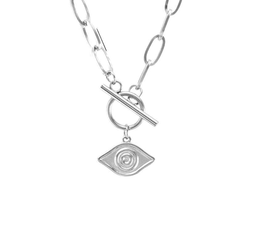 Este collar plateado con eslabones es elegante y protector. Su diseño incorpora el ojo turco, símbolo de buena suerte y protección contra el mal de ojo. Perfecto para añadir estilo y seguridad a cualquier atuendo.Material Acero QuirúrgicoMedidas 45 cm
