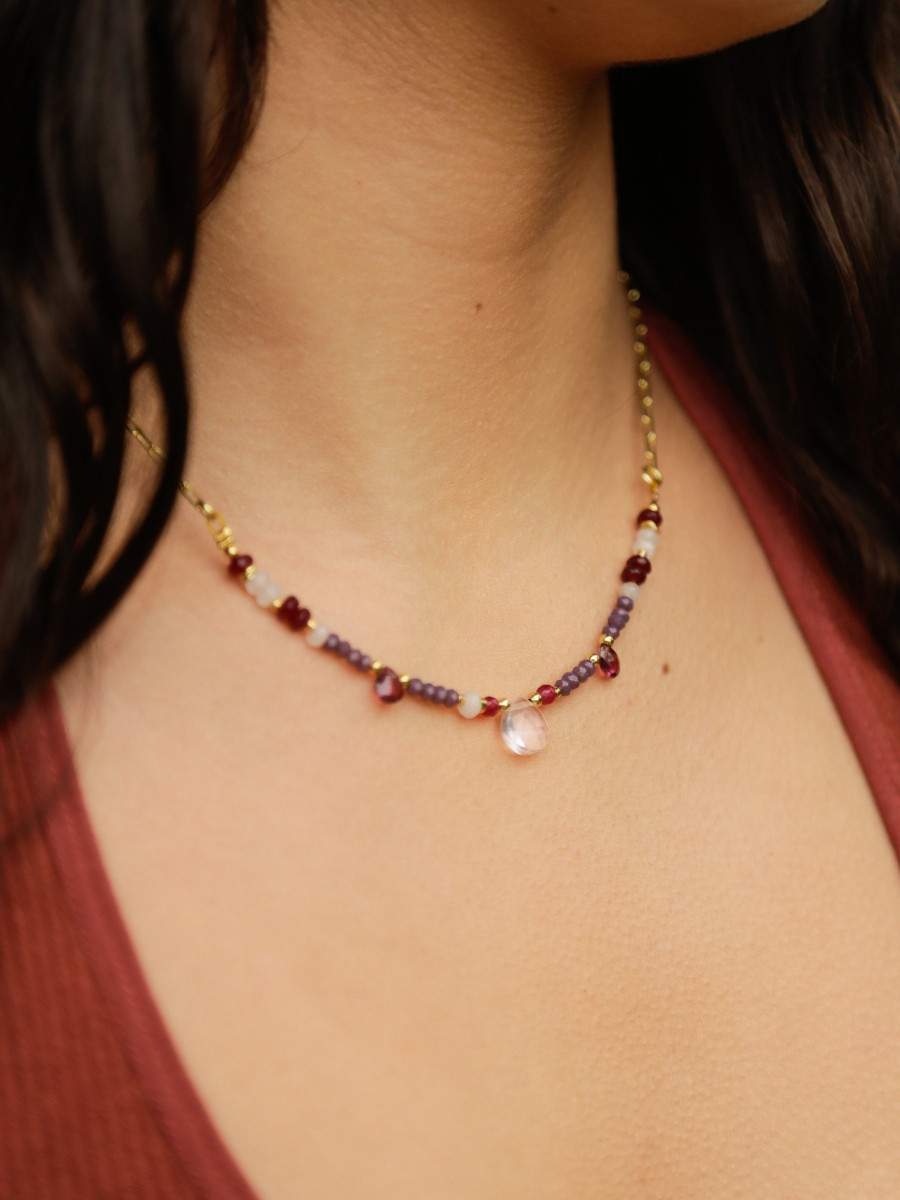 Collar ideal para resaltar tu outfit con colores. Perfecto para combinar con otros collares más largos. Úsalo tanto de día como de noche. El Collar Alma Granate tiene cristales y Ágatas en tonos granate, burdeo y morado, con gotas naturales granate y un Cuarzo rosado al centro. . Diseño exclusivo y único, hecho a mano en Chile. Se entrega envuelto en un papel seda dentro de una preciosa cajita. Perfecta para regalar y quedar como reina.