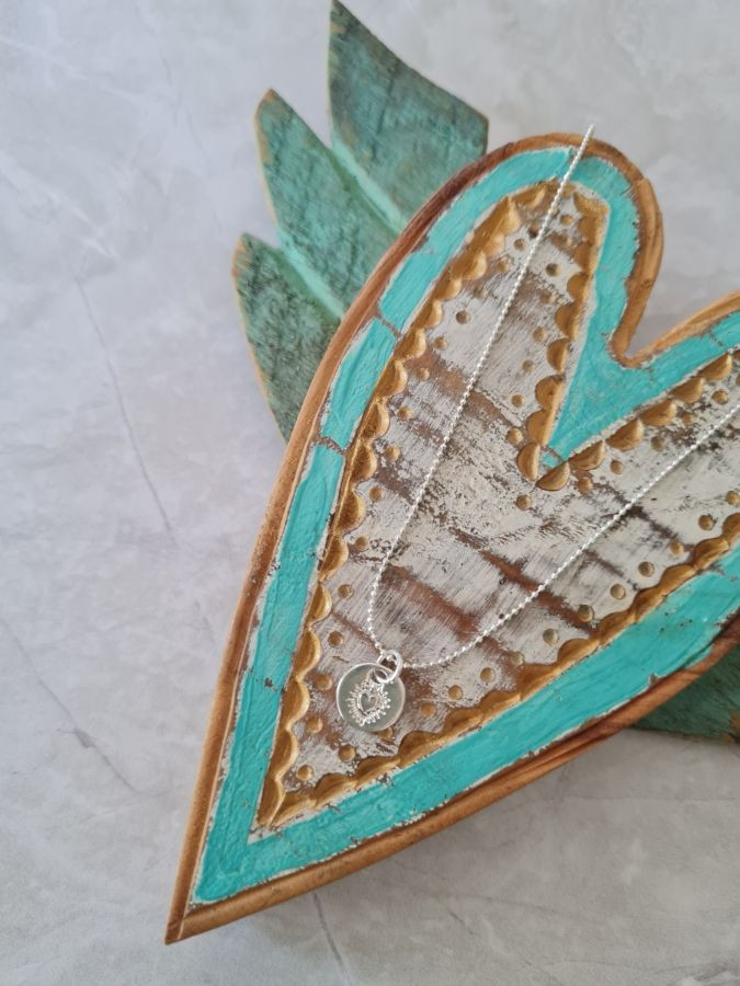 Collar Con Corazón Repujado bañado en plata. El Corazón Mide 1cm . La cadena mide 45cm