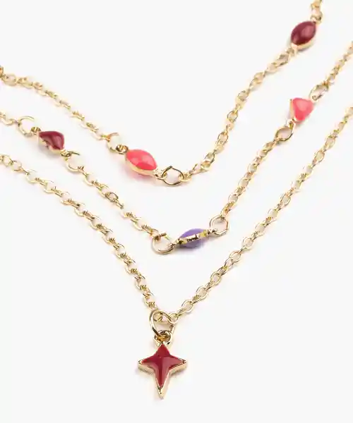 Corto Dorado Con 3 Cadenas Dos de Ellas Tienen Mostacillas de Resina de Color Burdeo Fucsia y Lila y la Tercera Tiene un Charm de Estrella de Resina Color Burdeo