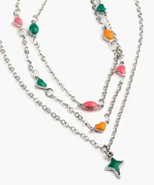 Corto Plateado Con 3 Cadenas Dos de Ellas Tienen Mostacillas de Resina de Color Naranjo Rosado Fluor y Verde y la Tercera Tiene un Charm de Estrella de Resina Color Verde