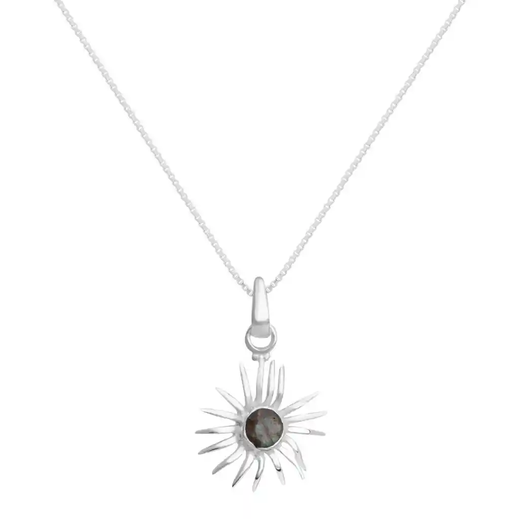 Collar con colgante en forma de sol con piedra natural redonda, elaborado en plata 925, libre de níquel. Medidas: Diámetro: 20mm Piedra: 6mm Piedra: Labradorita: Energía y creatividad. Cambios: 1 mes