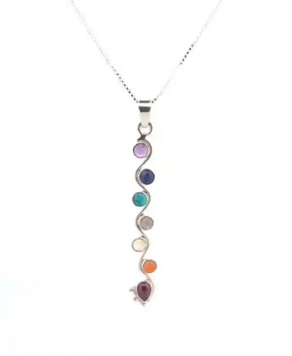 Collar con colgante de piedras naturales, elaborado en plata 925, libre de níquel. Medidas: Cadena: ajustable (se ajusta a 45, 50 y 55cm) Colgante: Normal: 6,5cm de largo XL: 8 c, de largo Piedras: Chakra básico: granate Chakra sacro: cornalina Chakra plexo solar: citrino Chakra corazón: cuarzo rosa Chakra garganta: turquesa Chakra tercer ojo: sodalita Chakra coronario: amatista Cambios: 1 mes Garantía: 3 meses